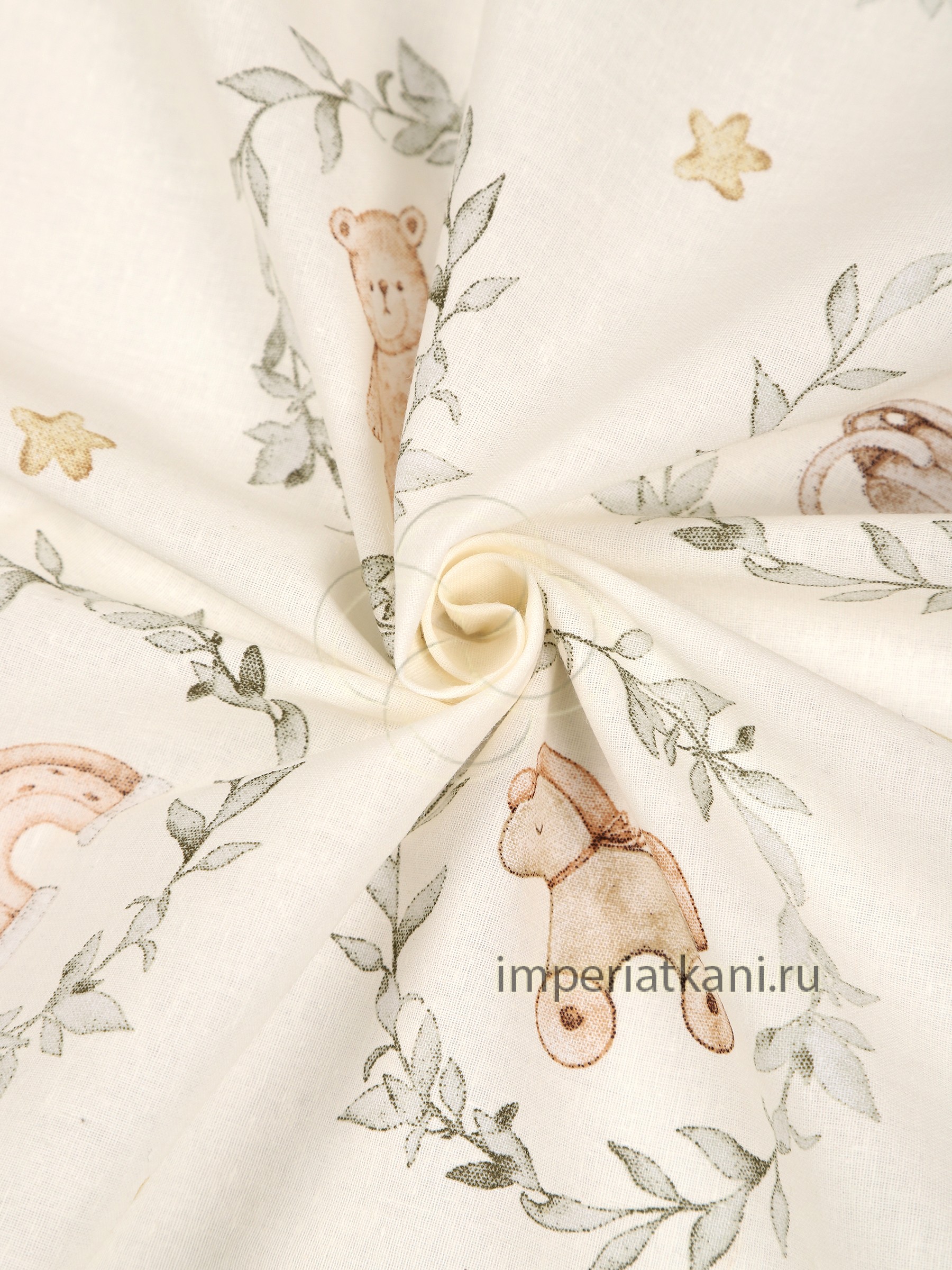Детская перкаль «Ясли» шириной 150 см с изображением на ткани — игрушки, лошадки, мишки; цветовая гамма: серая, шампань. Опт от 30 000 руб., продажа рулонами.